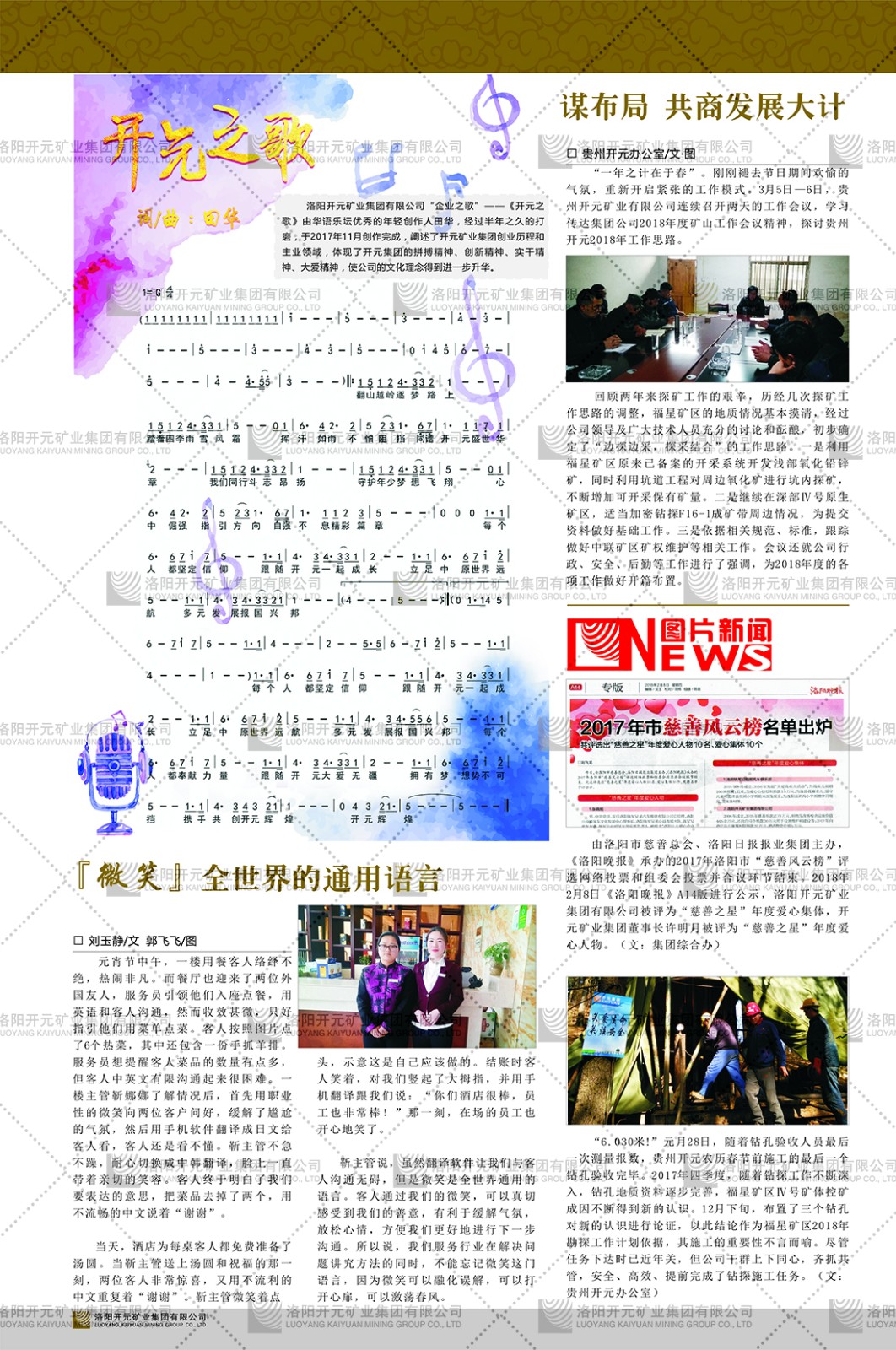 洛陽開元礦業(yè)集團有限公司簡介洛陽開元礦業(yè)集團有限公司,始成立于2006年,位于洛陽市開元大道269號。集團旗下共有十余家全資子公司,業(yè)務涉及有色金屬礦山開發(fā)、礦產(chǎn)品購銷與進出口貿(mào)易、房地產(chǎn)開發(fā)、文化藝術、企業(yè)管理與咨詢、資本投資等多個領域。2024年,集團公司銷售總額達7.8億元。民建河南省委委員、民建河南省委企業(yè)委副主任、民建洛陽市委委員、企業(yè)委主任、洛陽民建企業(yè)家協(xié)會會長許明月是公司創(chuàng)始人,現(xiàn)任洛陽開元礦業(yè)集團有限公司董事長。在礦業(yè)領域,洛陽開元礦業(yè)集團擁有多家實力雄厚的子公司:貴州開元礦業(yè)有限公司探、采礦權面積共11.33平方公里;興??h銅鑫礦業(yè)有限公司探礦權面積8.76平方公里,礦山資源潛力巨大;2021年,開元集團與盧氏中科礦業(yè)有限公司開展戰(zhàn)略合作。盧氏中科礦業(yè)有限公司專注于有色金屬的浮選、加工和銷售,擁有強大的技術支撐平臺,是集探、采、選、冶、研為一體的中大型綜合礦業(yè)企業(yè)。目前,盧氏中科王家河1000噸選礦廠已成功投產(chǎn),雙河金礦、柳關欒盧鉛鋅礦相繼順利開工,樓房銀礦與圪老灣鉛鋅礦的深部探礦重大突破,標志著礦山版圖取得重大進展,為開元集團后續(xù)發(fā)展奠定了堅實基礎。在文化傳媒領域,洛陽市明月美術館通過豐富多樣的藝術展覽、學術研討和公共教育活動,努力打造一個集展覽、交流、教育、研究為一體的綜合性藝術平臺。此外,在金融投資領域,開元集團旗下的北京明峰資本管理有限公司專注于投資具有高增長潛力的優(yōu)秀企業(yè),特別是高科技、新能源、環(huán)保等新興產(chǎn)業(yè),為客戶提供個性化的資產(chǎn)配置服務。在做好企業(yè)經(jīng)營的同時,開元集團始終不忘企業(yè)的社會責任和家國情懷,以突出的愛心公益事跡,開展了一系列公益慈善活動:“民建林”公益事業(yè)通過“思源基金”“幫幫公益”線上公益平臺,與眾多愛心人士籌措資金20余萬元;資助541名貧困大學生共計270余萬元,推進“數(shù)字助力——河南AI人才培養(yǎng)”;捐款10萬元,馳援京津冀、黑龍江洪水地質(zhì)災害……公司于2017年底被洛陽市慈善總會評為“洛陽慈善風云榜——十大愛心集體”。洛陽開元礦業(yè)集團有限公司秉承持續(xù)發(fā)展理念,憑借多年來良好的企業(yè)信譽與經(jīng)營業(yè)績,與全國多家企業(yè)建立了良好合作關系,受到社會各界的一致好評,多次榮獲“納稅標兵”“先進企業(yè)”“招商引資模范企業(yè)”等榮譽稱號?;赝麃頃r路,開元人勠力同心,以“闖”的精神和“創(chuàng)”的勁頭,一路披荊斬棘,踏過千山萬水;展望新未來,開元人凝心聚力,不執(zhí)于“舊”,無畏于“新”,秉承“勇于跨越,追求卓越”的企業(yè)精神,乘著國家高質(zhì)量發(fā)展新征程的東風,跨過高山,越過大海,向著集團多元化、國際化的目標,逐夢遠航,跨越前行!