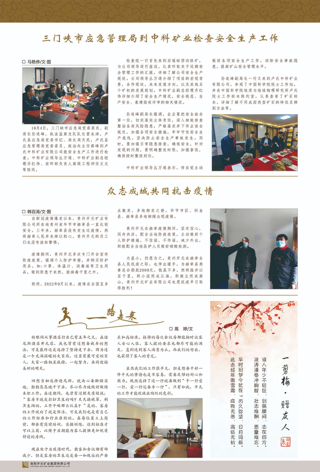 洛陽開元礦業(yè)集團有限公司簡介洛陽開元礦業(yè)集團有限公司,始成立于2006年,位于洛陽市開元大道269號。集團旗下共有十余家全資子公司,業(yè)務(wù)涉及有色金屬礦山開發(fā)、礦產(chǎn)品購銷與進出口貿(mào)易、房地產(chǎn)開發(fā)、文化藝術(shù)、企業(yè)管理與咨詢、資本投資等多個領(lǐng)域。2024年,集團公司銷售總額達7.8億元。民建河南省委委員、民建河南省委企業(yè)委副主任、民建洛陽市委委員、企業(yè)委主任、洛陽民建企業(yè)家協(xié)會會長許明月是公司創(chuàng)始人,現(xiàn)任洛陽開元礦業(yè)集團有限公司董事長。在礦業(yè)領(lǐng)域,洛陽開元礦業(yè)集團擁有多家實力雄厚的子公司:貴州開元礦業(yè)有限公司探、采礦權(quán)面積共11.33平方公里;興??h銅鑫礦業(yè)有限公司探礦權(quán)面積8.76平方公里,礦山資源潛力巨大;2021年,開元集團與盧氏中科礦業(yè)有限公司開展戰(zhàn)略合作。盧氏中科礦業(yè)有限公司專注于有色金屬的浮選、加工和銷售,擁有強大的技術(shù)支撐平臺,是集探、采、選、冶、研為一體的中大型綜合礦業(yè)企業(yè)。目前,盧氏中科王家河1000噸選礦廠已成功投產(chǎn),雙河金礦、柳關(guān)欒盧鉛鋅礦相繼順利開工,樓房銀礦與圪老灣鉛鋅礦的深部探礦重大突破,標志著礦山版圖取得重大進展,為開元集團后續(xù)發(fā)展奠定了堅實基礎(chǔ)。在文化傳媒領(lǐng)域,洛陽市明月美術(shù)館通過豐富多樣的藝術(shù)展覽、學術(shù)研討和公共教育活動,努力打造一個集展覽、交流、教育、研究為一體的綜合性藝術(shù)平臺。此外,在金融投資領(lǐng)域,開元集團旗下的北京明峰資本管理有限公司專注于投資具有高增長潛力的優(yōu)秀企業(yè),特別是高科技、新能源、環(huán)保等新興產(chǎn)業(yè),為客戶提供個性化的資產(chǎn)配置服務(wù)。在做好企業(yè)經(jīng)營的同時,開元集團始終不忘企業(yè)的社會責任和家國情懷,以突出的愛心公益事跡,開展了一系列公益慈善活動:“民建林”公益事業(yè)通過“思源基金”“幫幫公益”線上公益平臺,與眾多愛心人士籌措資金20余萬元;資助541名貧困大學生共計270余萬元,推進“數(shù)字助力——河南AI人才培養(yǎng)”;捐款10萬元,馳援京津冀、黑龍江洪水地質(zhì)災(zāi)害……公司于2017年底被洛陽市慈善總會評為“洛陽慈善風云榜——十大愛心集體”。洛陽開元礦業(yè)集團有限公司秉承持續(xù)發(fā)展理念,憑借多年來良好的企業(yè)信譽與經(jīng)營業(yè)績,與全國多家企業(yè)建立了良好合作關(guān)系,受到社會各界的一致好評,多次榮獲“納稅標兵”“先進企業(yè)”“招商引資模范企業(yè)”等榮譽稱號?;赝麃頃r路,開元人勠力同心,以“闖”的精神和“創(chuàng)”的勁頭,一路披荊斬棘,踏過千山萬水;展望新未來,開元人凝心聚力,不執(zhí)于“舊”,無畏于“新”,秉承“勇于跨越,追求卓越”的企業(yè)精神,乘著國家高質(zhì)量發(fā)展新征程的東風,跨過高山,越過大海,向著集團多元化、國際化的目標,逐夢遠航,跨越前行!