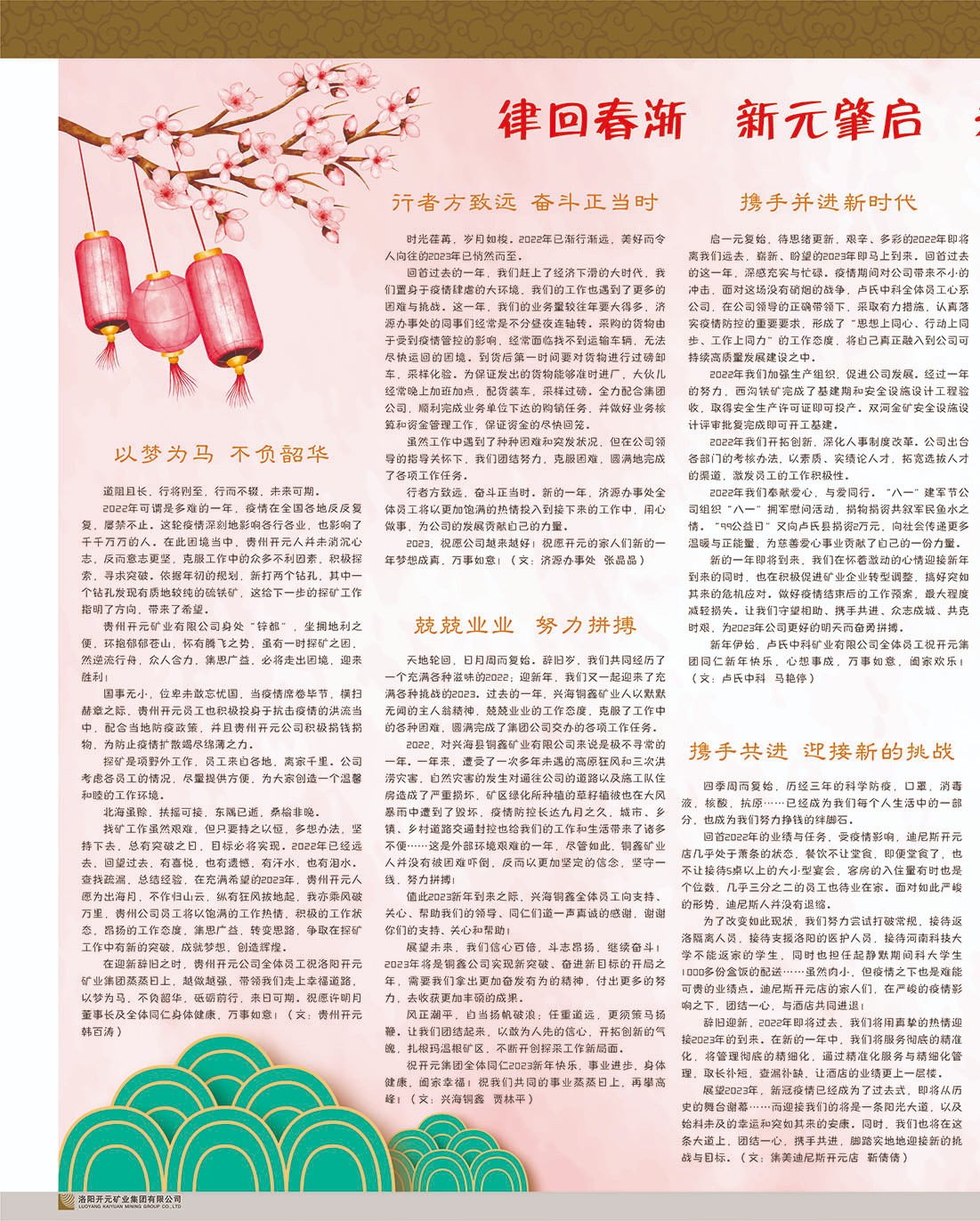 洛陽開元礦業(yè)集團(tuán)有限公司簡介洛陽開元礦業(yè)集團(tuán)有限公司,始成立于2006年,位于洛陽市開元大道269號。集團(tuán)旗下共有十余家全資子公司,業(yè)務(wù)涉及有色金屬礦山開發(fā)、礦產(chǎn)品購銷與進(jìn)出口貿(mào)易、房地產(chǎn)開發(fā)、文化藝術(shù)、企業(yè)管理與咨詢、資本投資等多個(gè)領(lǐng)域。2024年,集團(tuán)公司銷售總額達(dá)7.8億元。民建河南省委委員、民建河南省委企業(yè)委副主任、民建洛陽市委委員、企業(yè)委主任、洛陽民建企業(yè)家協(xié)會(huì)會(huì)長許明月是公司創(chuàng)始人,現(xiàn)任洛陽開元礦業(yè)集團(tuán)有限公司董事長。在礦業(yè)領(lǐng)域,洛陽開元礦業(yè)集團(tuán)擁有多家實(shí)力雄厚的子公司:貴州開元礦業(yè)有限公司探、采礦權(quán)面積共11.33平方公里;興海縣銅鑫礦業(yè)有限公司探礦權(quán)面積8.76平方公里,礦山資源潛力巨大;2021年,開元集團(tuán)與盧氏中科礦業(yè)有限公司開展戰(zhàn)略合作。盧氏中科礦業(yè)有限公司專注于有色金屬的浮選、加工和銷售,擁有強(qiáng)大的技術(shù)支撐平臺,是集探、采、選、冶、研為一體的中大型綜合礦業(yè)企業(yè)。目前,盧氏中科王家河1000噸選礦廠已成功投產(chǎn),雙河金礦、柳關(guān)欒盧鉛鋅礦相繼順利開工,樓房銀礦與圪老灣鉛鋅礦的深部探礦重大突破,標(biāo)志著礦山版圖取得重大進(jìn)展,為開元集團(tuán)后續(xù)發(fā)展奠定了堅(jiān)實(shí)基礎(chǔ)。在文化傳媒領(lǐng)域,洛陽市明月美術(shù)館通過豐富多樣的藝術(shù)展覽、學(xué)術(shù)研討和公共教育活動(dòng),努力打造一個(gè)集展覽、交流、教育、研究為一體的綜合性藝術(shù)平臺。此外,在金融投資領(lǐng)域,開元集團(tuán)旗下的北京明峰資本管理有限公司專注于投資具有高增長潛力的優(yōu)秀企業(yè),特別是高科技、新能源、環(huán)保等新興產(chǎn)業(yè),為客戶提供個(gè)性化的資產(chǎn)配置服務(wù)。在做好企業(yè)經(jīng)營的同時(shí),開元集團(tuán)始終不忘企業(yè)的社會(huì)責(zé)任和家國情懷,以突出的愛心公益事跡,開展了一系列公益慈善活動(dòng):“民建林”公益事業(yè)通過“思源基金”“幫幫公益”線上公益平臺,與眾多愛心人士籌措資金20余萬元;資助541名貧困大學(xué)生共計(jì)270余萬元,推進(jìn)“數(shù)字助力——河南AI人才培養(yǎng)”;捐款10萬元,馳援京津冀、黑龍江洪水地質(zhì)災(zāi)害……公司于2017年底被洛陽市慈善總會(huì)評為“洛陽慈善風(fēng)云榜——十大愛心集體”。洛陽開元礦業(yè)集團(tuán)有限公司秉承持續(xù)發(fā)展理念,憑借多年來良好的企業(yè)信譽(yù)與經(jīng)營業(yè)績,與全國多家企業(yè)建立了良好合作關(guān)系,受到社會(huì)各界的一致好評,多次榮獲“納稅標(biāo)兵”“先進(jìn)企業(yè)”“招商引資模范企業(yè)”等榮譽(yù)稱號。回望來時(shí)路,開元人勠力同心,以“闖”的精神和“創(chuàng)”的勁頭,一路披荊斬棘,踏過千山萬水;展望新未來,開元人凝心聚力,不執(zhí)于“舊”,無畏于“新”,秉承“勇于跨越,追求卓越”的企業(yè)精神,乘著國家高質(zhì)量發(fā)展新征程的東風(fēng),跨過高山,越過大海,向著集團(tuán)多元化、國際化的目標(biāo),逐夢遠(yuǎn)航,跨越前行!