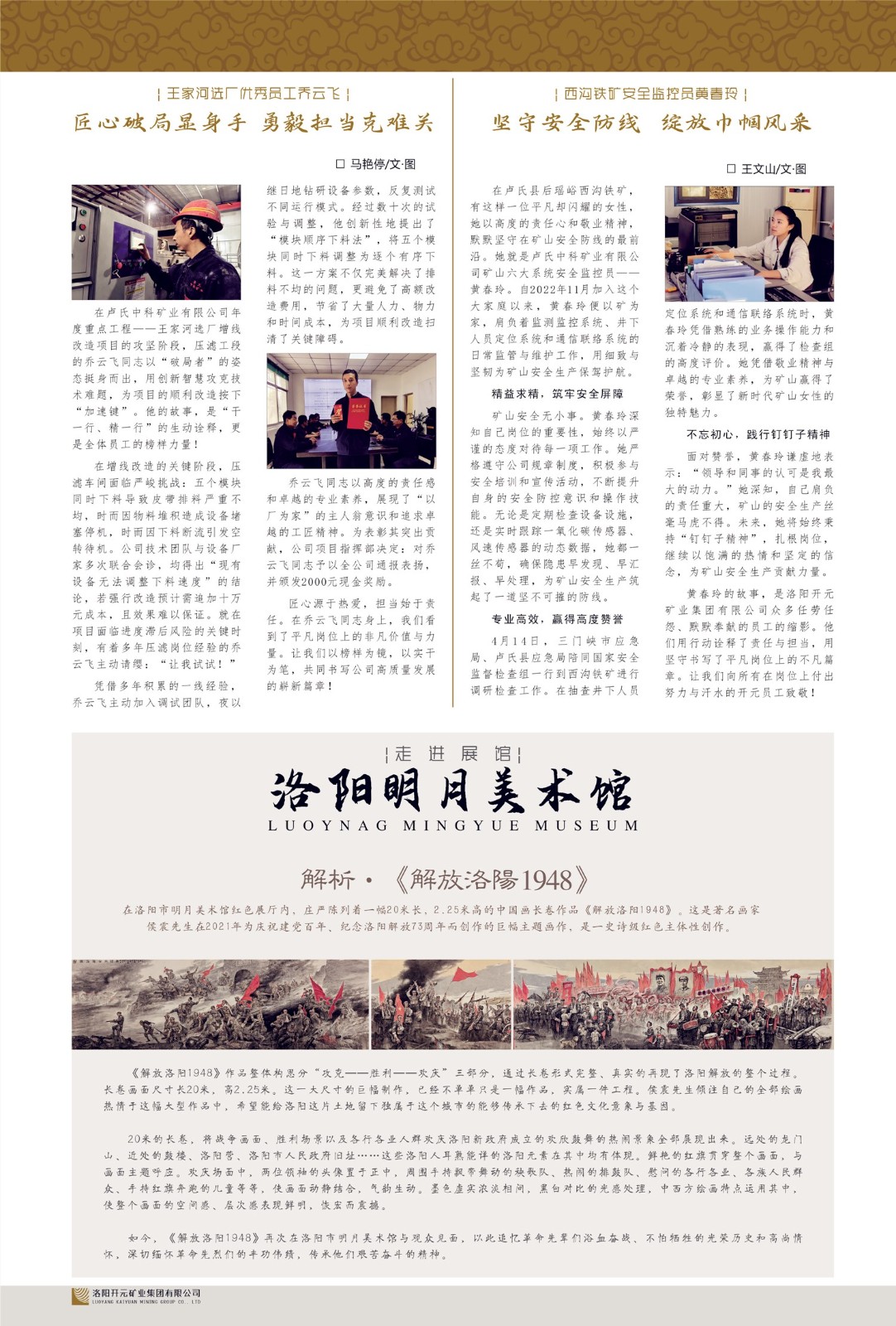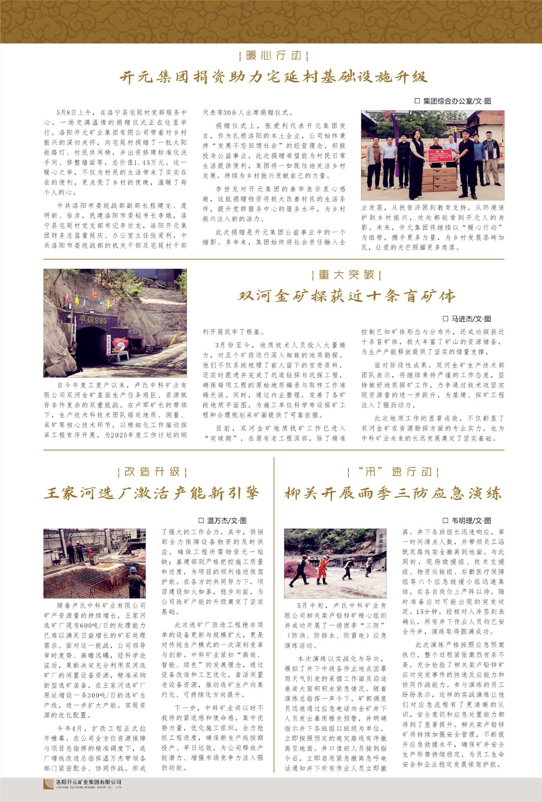 洛陽(yáng)開(kāi)元礦業(yè)集團(tuán)有限公司簡(jiǎn)介洛陽(yáng)開(kāi)元礦業(yè)集團(tuán)有限公司,始成立于2006年,位于洛陽(yáng)市開(kāi)元大道269號(hào)。集團(tuán)旗下共有十余家全資子公司,業(yè)務(wù)涉及有色金屬礦山開(kāi)發(fā)、礦產(chǎn)品購(gòu)銷與進(jìn)出口貿(mào)易、房地產(chǎn)開(kāi)發(fā)、文化藝術(shù)、企業(yè)管理與咨詢、資本投資等多個(gè)領(lǐng)域。2024年,集團(tuán)公司銷售總額達(dá)7.8億元。民建河南省委委員、民建河南省委企業(yè)委副主任、民建洛陽(yáng)市委委員、企業(yè)委主任、洛陽(yáng)民建企業(yè)家協(xié)會(huì)會(huì)長(zhǎng)許明月是公司創(chuàng)始人,現(xiàn)任洛陽(yáng)開(kāi)元礦業(yè)集團(tuán)有限公司董事長(zhǎng)。在礦業(yè)領(lǐng)域,洛陽(yáng)開(kāi)元礦業(yè)集團(tuán)擁有多家實(shí)力雄厚的子公司:貴州開(kāi)元礦業(yè)有限公司探、采礦權(quán)面積共11.33平方公里;興??h銅鑫礦業(yè)有限公司探礦權(quán)面積8.76平方公里,礦山資源潛力巨大;2021年,開(kāi)元集團(tuán)與盧氏中科礦業(yè)有限公司開(kāi)展戰(zhàn)略合作。盧氏中科礦業(yè)有限公司專注于有色金屬的浮選、加工和銷售,擁有強(qiáng)大的技術(shù)支撐平臺(tái),是集探、采、選、冶、研為一體的中大型綜合礦業(yè)企業(yè)。目前,盧氏中科王家河1000噸選礦廠已成功投產(chǎn),雙河金礦、柳關(guān)欒盧鉛鋅礦相繼順利開(kāi)工,樓房銀礦與圪老灣鉛鋅礦的深部探礦重大突破,標(biāo)志著礦山版圖取得重大進(jìn)展,為開(kāi)元集團(tuán)后續(xù)發(fā)展奠定了堅(jiān)實(shí)基礎(chǔ)。在文化傳媒領(lǐng)域,洛陽(yáng)市明月美術(shù)館通過(guò)豐富多樣的藝術(shù)展覽、學(xué)術(shù)研討和公共教育活動(dòng),努力打造一個(gè)集展覽、交流、教育、研究為一體的綜合性藝術(shù)平臺(tái)。此外,在金融投資領(lǐng)域,開(kāi)元集團(tuán)旗下的北京明峰資本管理有限公司專注于投資具有高增長(zhǎng)潛力的優(yōu)秀企業(yè),特別是高科技、新能源、環(huán)保等新興產(chǎn)業(yè),為客戶提供個(gè)性化的資產(chǎn)配置服務(wù)。在做好企業(yè)經(jīng)營(yíng)的同時(shí),開(kāi)元集團(tuán)始終不忘企業(yè)的社會(huì)責(zé)任和家國(guó)情懷,以突出的愛(ài)心公益事跡,開(kāi)展了一系列公益慈善活動(dòng):“民建林”公益事業(yè)通過(guò)“思源基金”“幫幫公益”線上公益平臺(tái),與眾多愛(ài)心人士籌措資金20余萬(wàn)元;資助541名貧困大學(xué)生共計(jì)270余萬(wàn)元,推進(jìn)“數(shù)字助力——河南AI人才培養(yǎng)”;捐款10萬(wàn)元,馳援京津冀、黑龍江洪水地質(zhì)災(zāi)害……公司于2017年底被洛陽(yáng)市慈善總會(huì)評(píng)為“洛陽(yáng)慈善風(fēng)云榜——十大愛(ài)心集體”。洛陽(yáng)開(kāi)元礦業(yè)集團(tuán)有限公司秉承持續(xù)發(fā)展理念,憑借多年來(lái)良好的企業(yè)信譽(yù)與經(jīng)營(yíng)業(yè)績(jī),與全國(guó)多家企業(yè)建立了良好合作關(guān)系,受到社會(huì)各界的一致好評(píng),多次榮獲“納稅標(biāo)兵”“先進(jìn)企業(yè)”“招商引資模范企業(yè)”等榮譽(yù)稱號(hào)?;赝麃?lái)時(shí)路,開(kāi)元人勠力同心,以“闖”的精神和“創(chuàng)”的勁頭,一路披荊斬棘,踏過(guò)千山萬(wàn)水;展望新未來(lái),開(kāi)元人凝心聚力,不執(zhí)于“舊”,無(wú)畏于“新”,秉承“勇于跨越,追求卓越”的企業(yè)精神,乘著國(guó)家高質(zhì)量發(fā)展新征程的東風(fēng),跨過(guò)高山,越過(guò)大海,向著集團(tuán)多元化、國(guó)際化的目標(biāo),逐夢(mèng)遠(yuǎn)航,跨越前行!