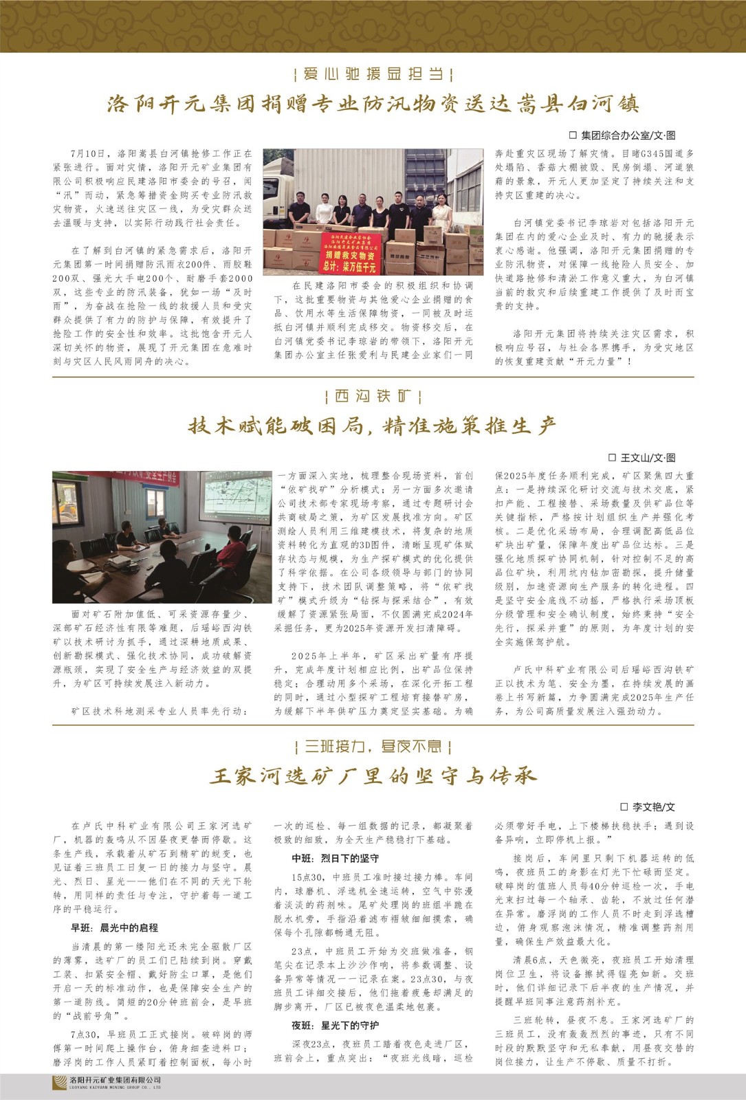 洛陽開元礦業(yè)集團(tuán)有限公司簡介洛陽開元礦業(yè)集團(tuán)有限公司,始成立于2006年,位于洛陽市開元大道269號。集團(tuán)旗下共有十余家全資子公司,業(yè)務(wù)涉及有色金屬礦山開發(fā)、礦產(chǎn)品購銷與進(jìn)出口貿(mào)易、房地產(chǎn)開發(fā)、文化藝術(shù)、企業(yè)管理與咨詢、資本投資等多個領(lǐng)域。2024年,集團(tuán)公司銷售總額達(dá)7.8億元。民建河南省委委員、民建河南省委企業(yè)委副主任、民建洛陽市委委員、企業(yè)委主任、洛陽民建企業(yè)家協(xié)會會長許明月是公司創(chuàng)始人,現(xiàn)任洛陽開元礦業(yè)集團(tuán)有限公司董事長。在礦業(yè)領(lǐng)域,洛陽開元礦業(yè)集團(tuán)擁有多家實(shí)力雄厚的子公司:貴州開元礦業(yè)有限公司探、采礦權(quán)面積共11.33平方公里;興??h銅鑫礦業(yè)有限公司探礦權(quán)面積8.76平方公里,礦山資源潛力巨大;2021年,開元集團(tuán)與盧氏中科礦業(yè)有限公司開展戰(zhàn)略合作。盧氏中科礦業(yè)有限公司專注于有色金屬的浮選、加工和銷售,擁有強(qiáng)大的技術(shù)支撐平臺,是集探、采、選、冶、研為一體的中大型綜合礦業(yè)企業(yè)。目前,盧氏中科王家河1000噸選礦廠已成功投產(chǎn),雙河金礦、柳關(guān)欒盧鉛鋅礦相繼順利開工,樓房銀礦與圪老灣鉛鋅礦的深部探礦重大突破,標(biāo)志著礦山版圖取得重大進(jìn)展,為開元集團(tuán)后續(xù)發(fā)展奠定了堅(jiān)實(shí)基礎(chǔ)。在文化傳媒領(lǐng)域,洛陽市明月美術(shù)館通過豐富多樣的藝術(shù)展覽、學(xué)術(shù)研討和公共教育活動,努力打造一個集展覽、交流、教育、研究為一體的綜合性藝術(shù)平臺。此外,在金融投資領(lǐng)域,開元集團(tuán)旗下的北京明峰資本管理有限公司專注于投資具有高增長潛力的優(yōu)秀企業(yè),特別是高科技、新能源、環(huán)保等新興產(chǎn)業(yè),為客戶提供個性化的資產(chǎn)配置服務(wù)。在做好企業(yè)經(jīng)營的同時,開元集團(tuán)始終不忘企業(yè)的社會責(zé)任和家國情懷,以突出的愛心公益事跡,開展了一系列公益慈善活動:“民建林”公益事業(yè)通過“思源基金”“幫幫公益”線上公益平臺,與眾多愛心人士籌措資金20余萬元;資助541名貧困大學(xué)生共計(jì)270余萬元,推進(jìn)“數(shù)字助力——河南AI人才培養(yǎng)”;捐款10萬元,馳援京津冀、黑龍江洪水地質(zhì)災(zāi)害……公司于2017年底被洛陽市慈善總會評為“洛陽慈善風(fēng)云榜——十大愛心集體”。洛陽開元礦業(yè)集團(tuán)有限公司秉承持續(xù)發(fā)展理念,憑借多年來良好的企業(yè)信譽(yù)與經(jīng)營業(yè)績,與全國多家企業(yè)建立了良好合作關(guān)系,受到社會各界的一致好評,多次榮獲“納稅標(biāo)兵”“先進(jìn)企業(yè)”“招商引資模范企業(yè)”等榮譽(yù)稱號?;赝麃頃r路,開元人勠力同心,以“闖”的精神和“創(chuàng)”的勁頭,一路披荊斬棘,踏過千山萬水;展望新未來,開元人凝心聚力,不執(zhí)于“舊”,無畏于“新”,秉承“勇于跨越,追求卓越”的企業(yè)精神,乘著國家高質(zhì)量發(fā)展新征程的東風(fēng),跨過高山,越過大海,向著集團(tuán)多元化、國際化的目標(biāo),逐夢遠(yuǎn)航,跨越前行!